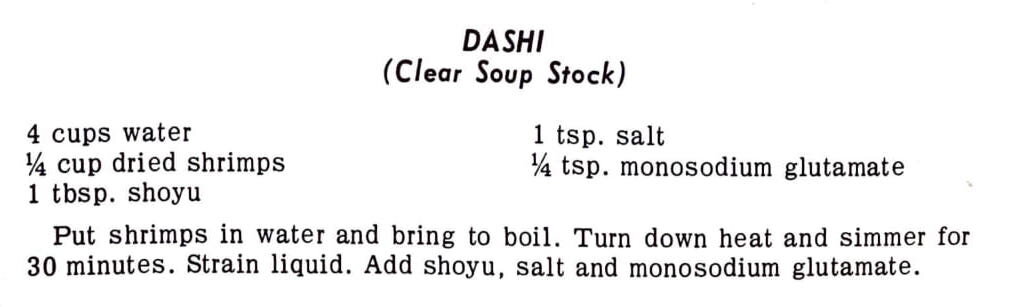 1 14-½-oz. can chicken broth 1 can water 1 white turnip, cut into 1/2-inch cubes 1 carrot, cut into ½-inch cubes 1 white potato, cut into ½-inch cubes 2 cloves garlic, minced 2 Tbsp shoyu 1 Tbsp. wine or sake (rice wine) ½ tsp. Dashi-no-Moto ¼ tsp. pepper Combine all the ingredients in a medium-size…
