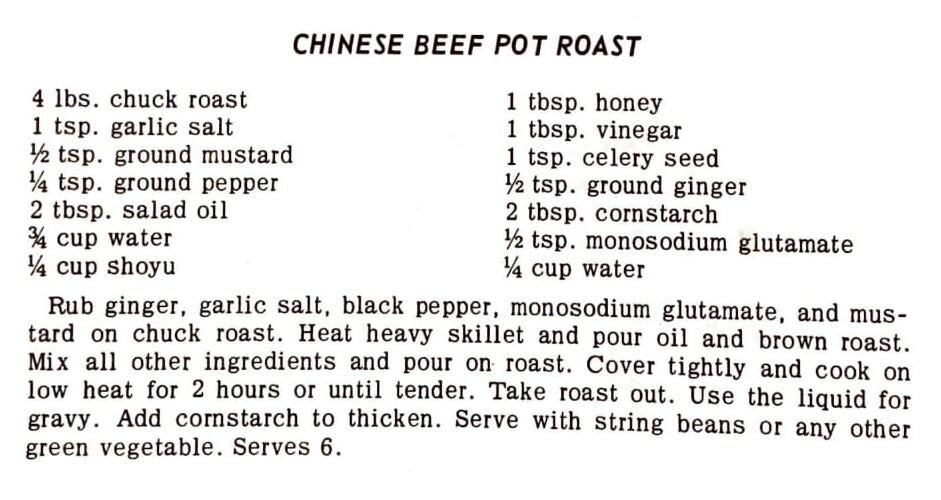 Rub ginger, garlic salt, black pepper, monosodium glutamate, and mustard on chuck roast. Heat heavy skillet and pour oil and brown roast. Mix all other ingredients and pour on roast. Cover tightly and cook on low heat for 2 hours or until tender. Take roast out. Use the liquid for gravy. Add cornstarch to thicken. Serve with string beans or any other green vegetable. Serves 6.