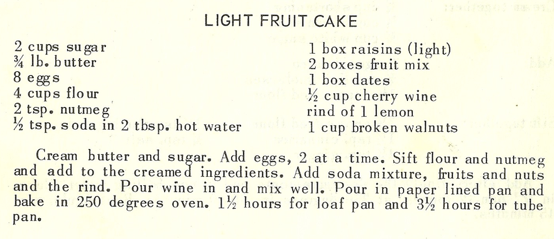 Cream butter and sugar. Add eggs. 2 at a time. Sift flour and nutmeg and add to the creamed ingredients. Add soda mixture, fruits and nuts and the rind. Pour wine in and mix well. Pour in paper lined pan and bake in 250 F oven. 1-1/2 hours for loaf pan – 3-1/2 hours for tube pan.