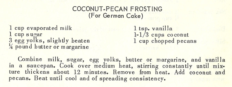 1 pkg. chocolate cake mix 2 eggs 1/4 c. oil 1/2 c. water or 7-Up 1 can cherry pie filling 1 tsp. almond extract sifted powdered sugar Mix cake mix, eggs, oil and water. Fold in cherries. Bake in 325 degree oven for 45-60 minutes. When warm, sprinkle with sifted powdered sugar.