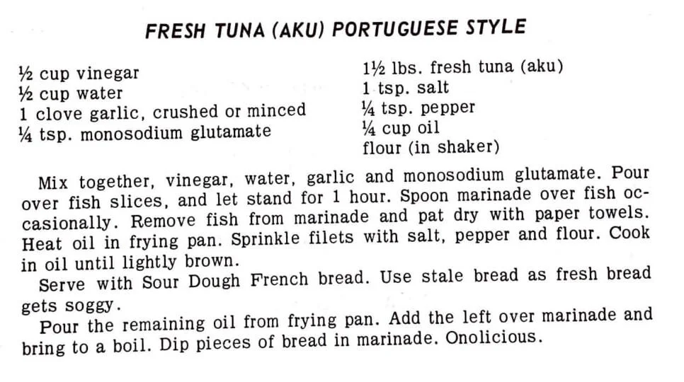 Mix together vinegar, water, garlic and monosodium glutamate. Pour over fish slices, and let stand for 1 hour. Spoon marinade over fish occasionally. Remove fish from marinade and pat dry with paper towels. Heat oil in frying pan. Sprinkle filets with salt, pepper and flour. Cook in oil until lightly flour.