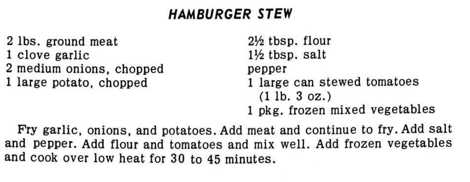 Fry garlic, onions, and potatoes. Add meat and continue to fry. Add salt and pepper. Add flour and tomatoes and mix well. Add frozen vegetables and cook over low heat for 30 to 45 minutes.