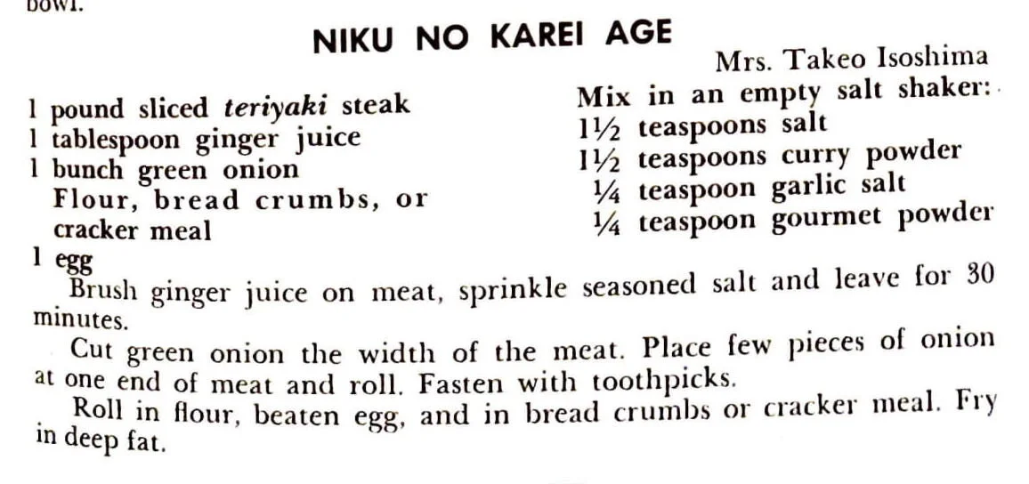 Cut green onion the width of the meat. Place few pieces of onion at one end of meat and roll. Fasten with toothpicks.
