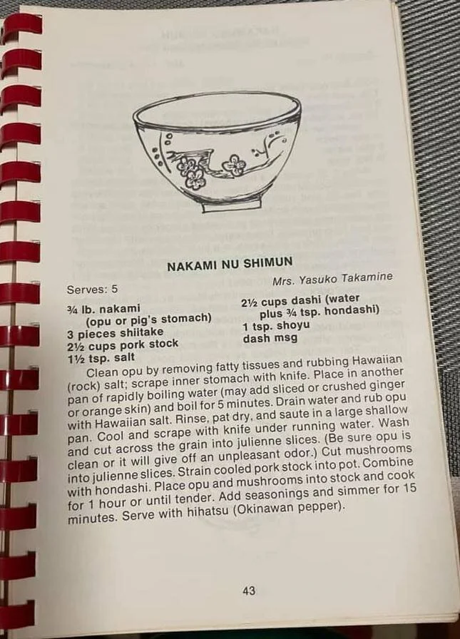SERVES: 6 1-1/2 lb. belly or shoulder pork 1 block tofu 1 large daikon 1 bunch mustard cabbage 2-1/2 cups pork stock oil for frying Seasonings: 1/4 cup shoyu 2 tsp. sugar dash msg Cover and parboil pork for 30 minutes. Cut tofu into 2 x 1/2 x 1/2 inch sizes. Place on clean dishcloth…
