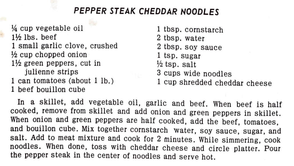 In a skillet, add vegetable oil, garlic and beef. When beef is half cooked, remove from skillet and add onion and green peppers in skillet. When onion and green peppers are half cooked, add the beef, tomatoes, and bouillon cube. Mix together cornstarch, water, soy sauce, sugar and salt. Add to meat mixture and cook for 2 minutes. While simmering, cook noodles. When done, toss with cheddar cheese and circle platter. Pour the pepper steak in the center of noodles and serve hot.