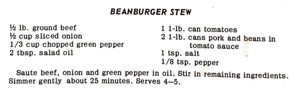 Saute beef, onion and green pepper in oil. Stir in remaining ingredients. Simmer gently about 25 minutes. Serves 4-5.
