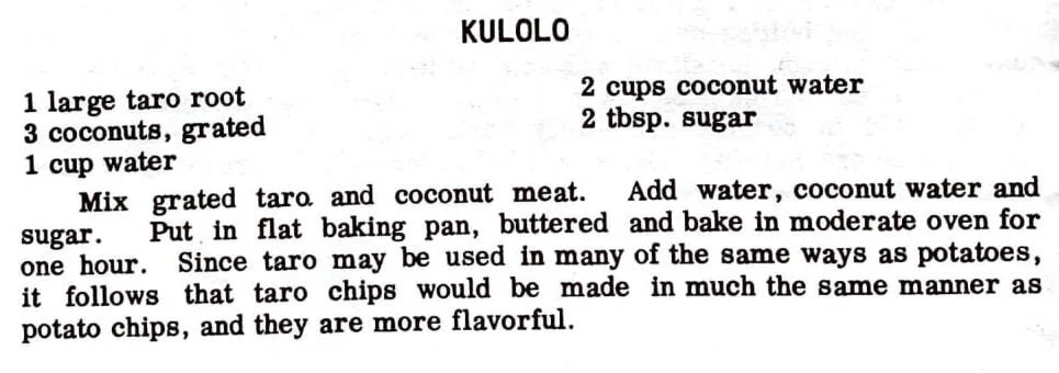 Mix grated taro and coconut meat. Add water, coconut water and sugar. Put in flat baking pan, buttered and bake in moderate oven for one hour. Since taro may be used in many of the same ways as potatoes, it follows that taro chips would be made in much the same manner as potato chips, and they are more flavorful.