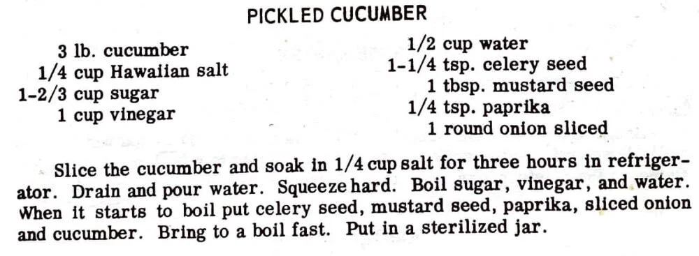 Slice the cucumber and soak In 1/4 cup salt for three hours in refrigerator. Drain and pour water. Squeeze hard. Boil sugar, vinegar, and water. When it starts to boil put celery seed, mustard seed, paprika, sliced onion, and cucumber. Bring to a boil fast. Put in a sterilized jar.