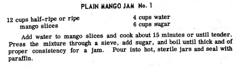 Add water to mango slices and cook about 15 minutes or until tender. Press the mixture through a sieve, add sugar, and boil until thick and of proper consistency for a Jam. Pour into hot, sterile Jars and seal with paraffin.