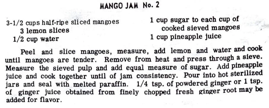 Peel and slice mangoes, measure, add lemon and water and cook until mangoes are tender. Remove from heat and press through a sieve. Measure the sieved pulp and add equal measure of sugar. Add pineapple juice and cook together until of jam consistency. Pour into bot sterilized jars and seal with melted paraffin. 1/4 tsp. of powdered ginger or 1 tsp. of ginger juice obtained from finely chopped fresh ginger root may be added for flavor.