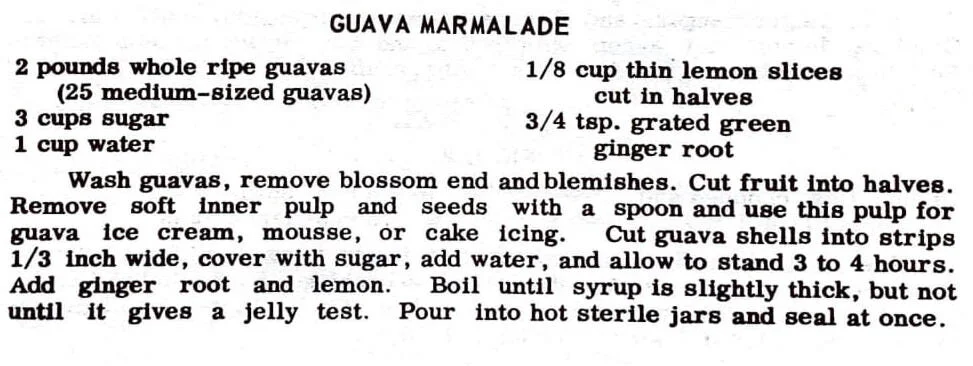 Wash guavas, remove blossom end and blemishes. Cut fruit Into halves. Remove soft inner pulp and seeds with a spoon and use this pulp for guava ice cream, mousse, or cake icing. Cut guava shells into strips 1/3 inch wide, cover with sugar, add water, and allow to stand 3 to 4 hours. Add ginger root and lemon. Boil until syrup is slightly thick, but not until it gives a jelly test. Pour into hot sterile jars and seal at once.