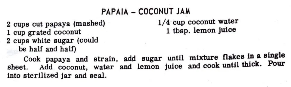 Cook papaya and strain, add sugar until mixture flakes in a single sheet. Add coconut, water and lemon juice and cook until thick. Pour into sterilized jar and seal.