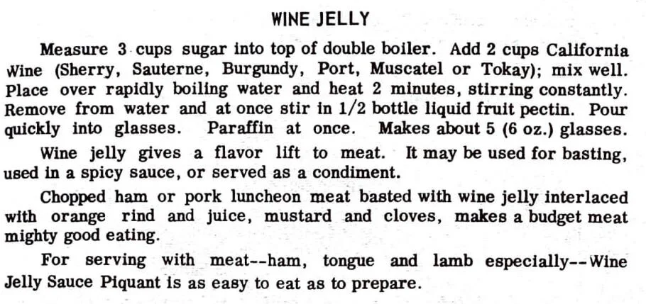 Measure 3 cups sugar into top of double boiler. Add 2 cups California Wine (Sherry, Sauterne, Burgundy, Port, Muscatel or Tokay); mix well. Place over rapidly boiling water and heat 2 minutes, stirring constantly. Remove from water and at once stir tn 1/2 bottle liquid fruit pectin. Pour quickly into glasses. Paraffin at once. Makes about 5 (6 oz.) glasses.