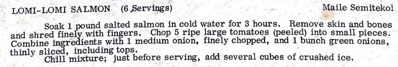 Soak 1 pound salted salmon in cold water for 3 hours. Remove skin and bones and shred finely with fingers. Chop 5 ripe large tomatoes (peeled) into small pieces. Combine ingredients with 1 medium onion, finely chopped, and 1 bunch green onions, thinly sliced, including tops.