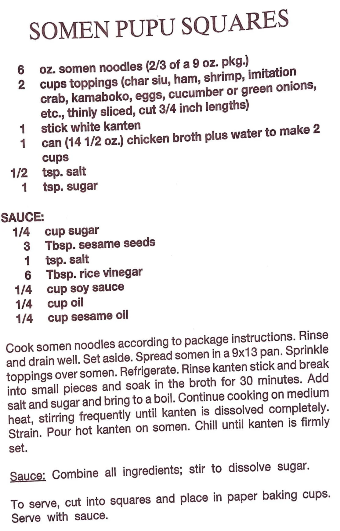 Cook somen noodles according to package instructions. Rinse and drain well. Set aside. Spread somen in a 9×13 pan. Sprinkle toppings over somen. Refrigerate. rinse kanten stick and break into small pieces and soak in the broth for 30 minutes. Add salt and sugar and bring to a boil. Continue cooking on medium heat, stirring frequently until kanten is dissolved completely. Strain. Pour hot kanten on somen. Chill until kanten is firmly set.