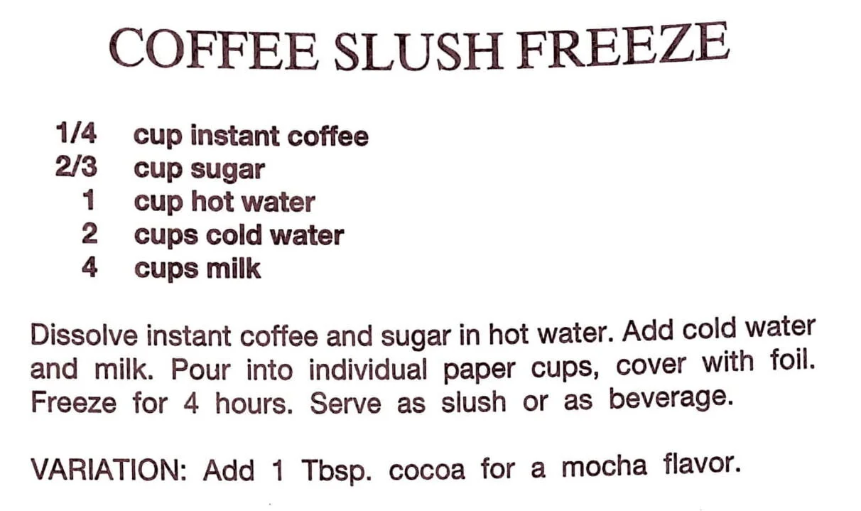 Dissolve instant coffee and sugar in hot water. Add cold water and milk. Pour into individual paper cups, cover with foil. Freeze for 4 hours. Serve as slush or as beverage.