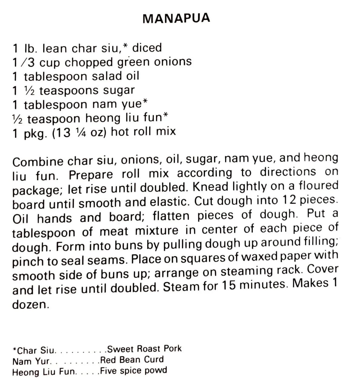 Combine char siu, onions, oil, sugar, nam yue, and heong liu fun. Prepare roll mix according to directions on package; let rise until doubled. Knead lightly on a floured board until smooth and elastic. Cut dough into 12 pieces. Oil hands and board; flatten pieces of dough. Put a tablespoon of meat mixture in center of each piece o dough. Form into buns by pulling dough up around filling; pinch to seal seams. Place on squares of waxed paper withh smooth side of buns up; arrange on steaming rack. Cover and let rise until doubled. Steam for 15 minutes. Makes 1 dozen.
