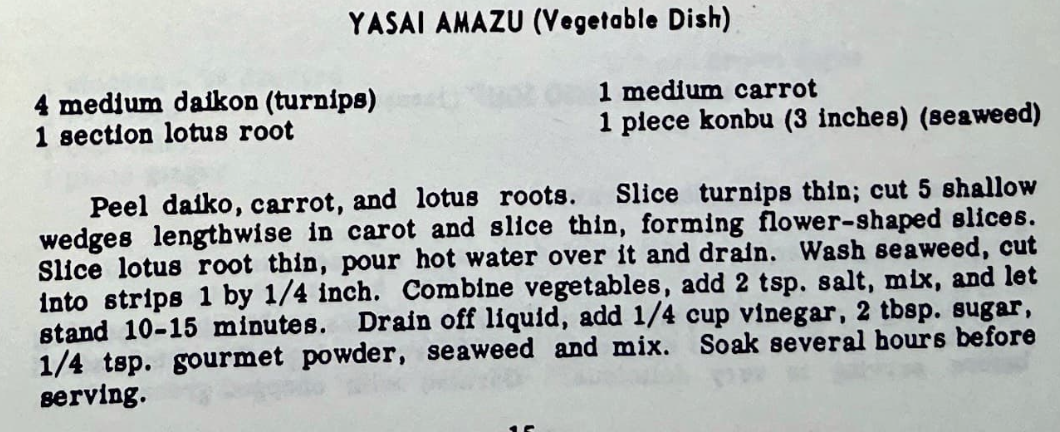 Peel daikon, carrot, and lotus roots. Slice turnips thin; cut 5 shallow wedges lengthwise in carrot and slice thin, forming flower-shaped slices. Slice lotus root thin, pour hot water over it and drain. Wash seaweed, cut into strips 1 by 1/ 4 inch. Combine vegetables, add 2 tsp. salt, mix, and let stand 10-15 minutes. Drain off liquid, add 1/4 cup vinegar, 2 tbsp. sugar, 1/4 tsp. gourmet powder, seaweed and mix. Soak several hours before serving.