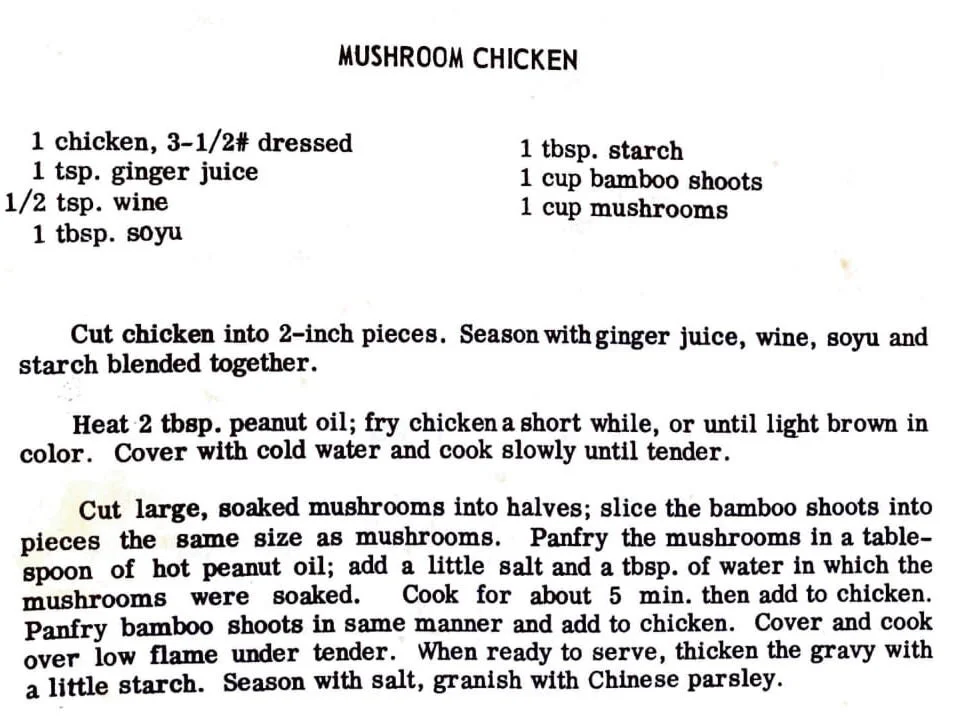 Cut large, soaked n,ushrooms into halves; slice the bamboo shoots into pieces the same size as mushrooms. Pan fry the mushrooms in a tablespoon of hot peanut oil; add a little salt and a tbsp. of water in which the mushrooms were soaked. Cook for about 5 min. then add to chicken. Pan fry bamboo shoots in same manner and add to chicken. Cover and cook over low flame under tender. When ready to serve, thicken the gravy with a little starch. Season with salt, granish with Chinese parsley.