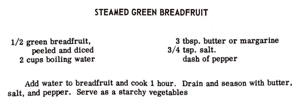 Add water to breadfruit and cook 1 hour. Drain and season with butter, salt and pepper. Serve as a starchy vegetables.