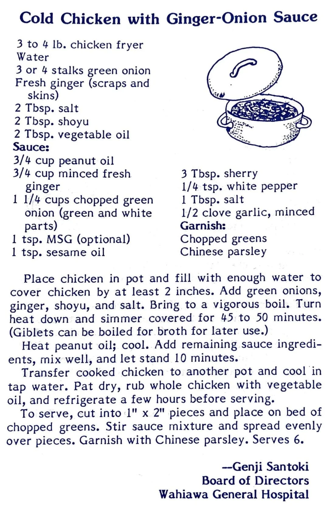 1 broiler minus fat 1-1/2 tsp. monosodium glutamate 1-1/2 tsp. salt 2-1/2 cups water 1/2 celery stalk and leaves 1/2 medium onion 1 bay leaf 1/8 tsp. peppercorns Place chicken in kettle and add remaining ingredients. Bring to a boil. Simmer 40 minutes. Cool quickly. Remove meat from bones. Cut meat in bite pieces. Strain…