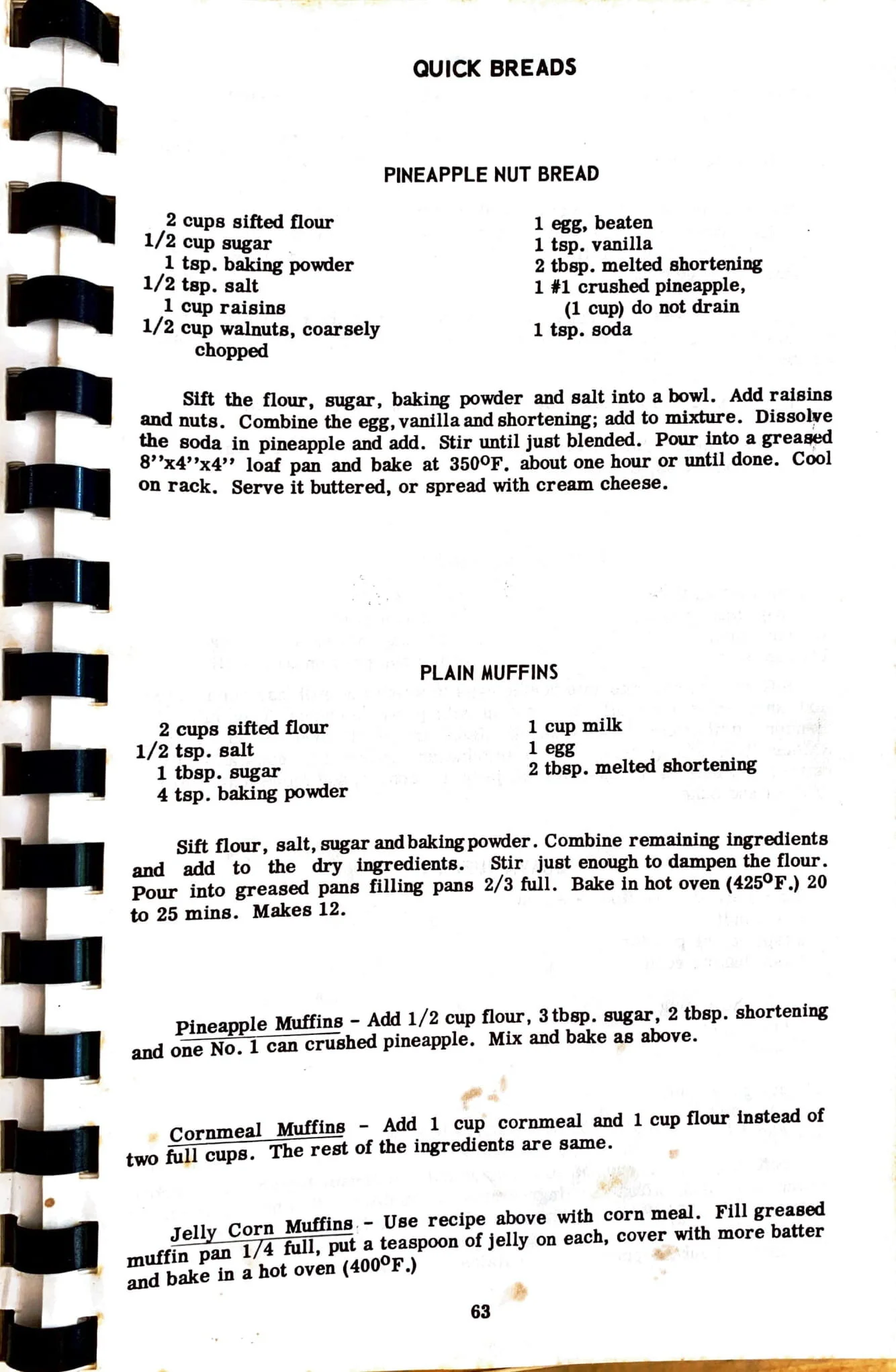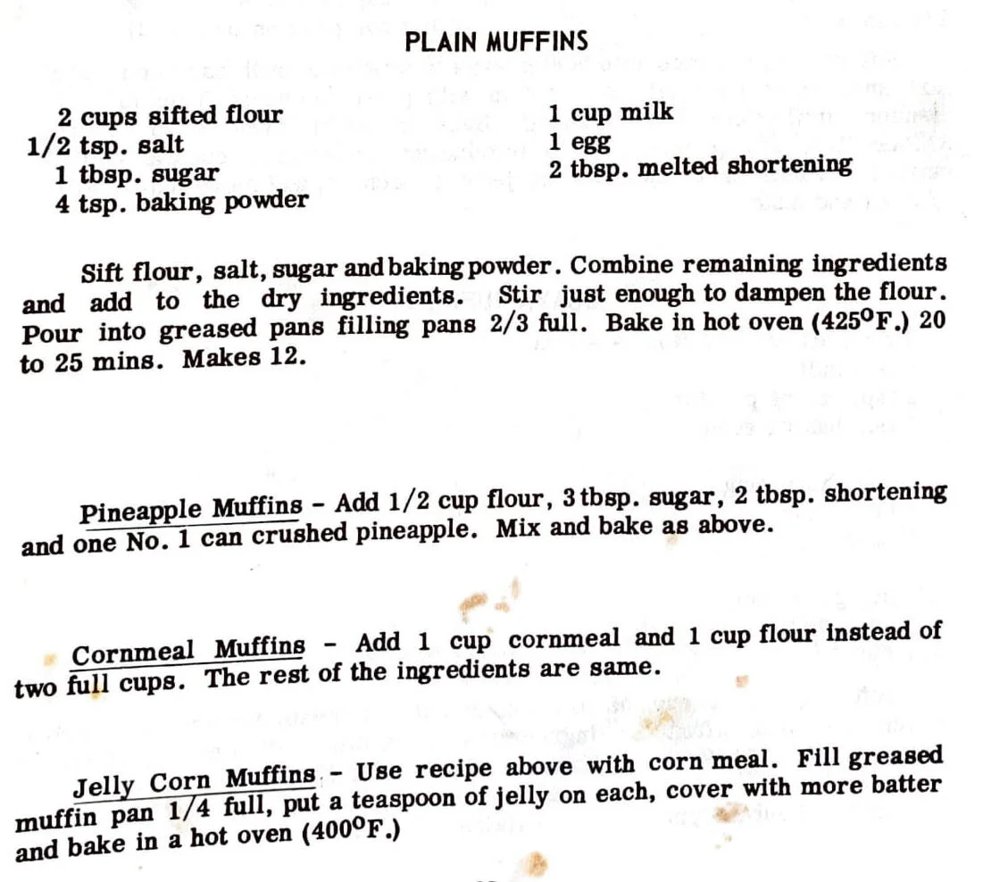 Pineapple Muffins – Add 1/2 cup flour, 3 tbsp. sugar, 2 tbsp. shortening and one No. 1 can crushed pineapple. Mix and bake as above.