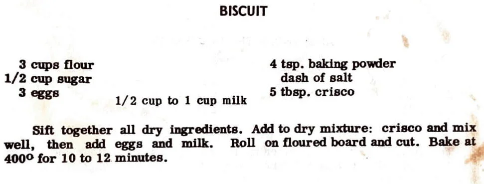 Sift together all dry ingredients. Add to dry mixture: criaco and mix well, then add eggs and milk. Roll on floured board and cut. Bake at 400 F for 10 to 12 minutes.