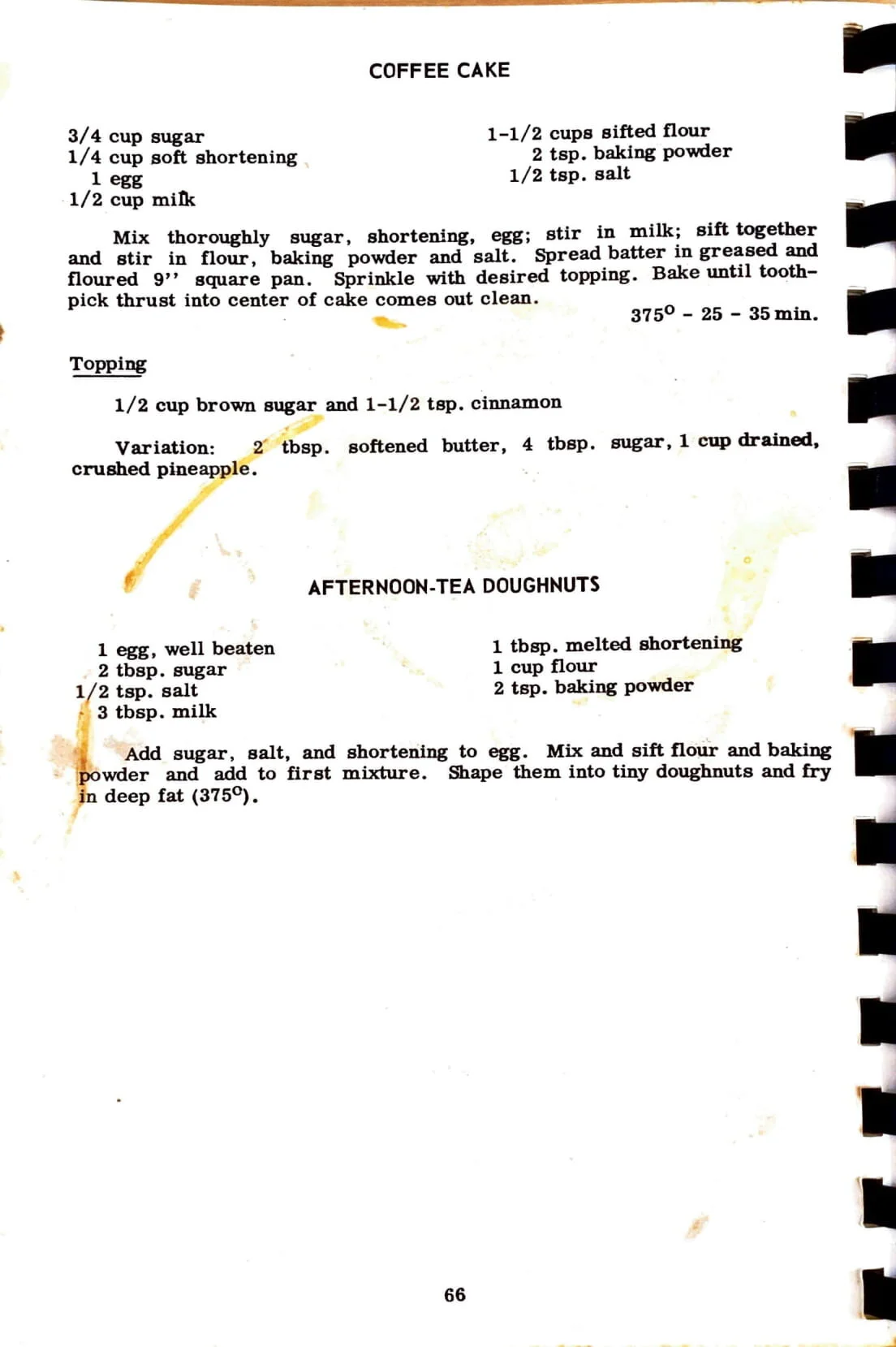 Add sugar, salt, and shortening to egg. Mix and sift flour and baking powder and add to first mixture. Shape them into tiny doughnuts and fry in deep fat (375).