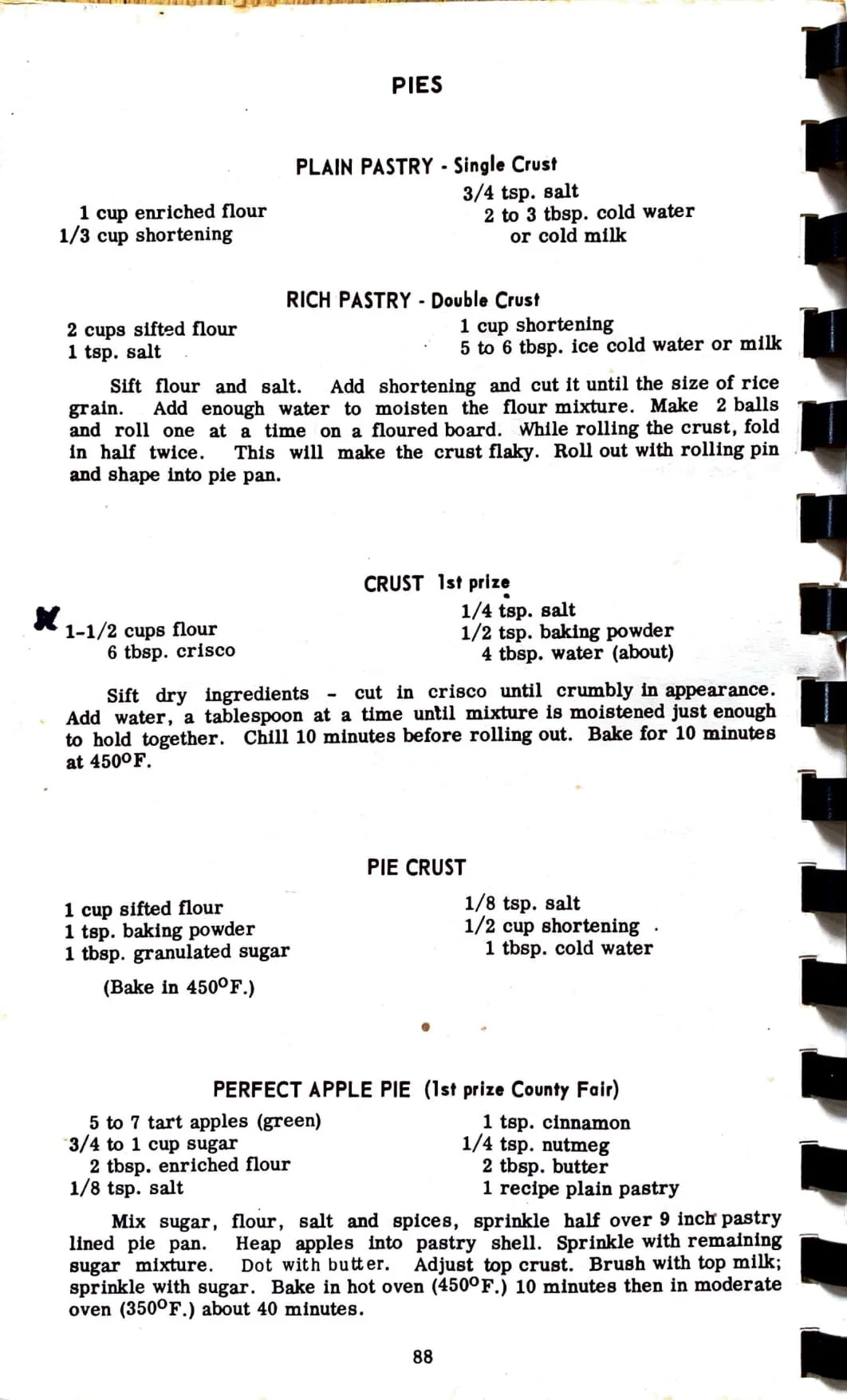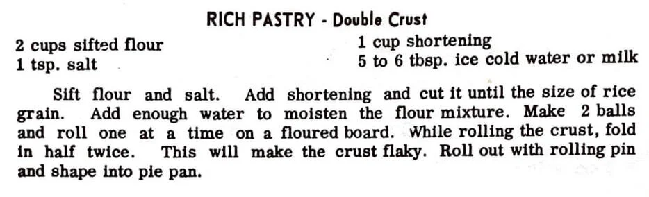 Sift flour and salt. Add shortening and cut it until the size of rice grain. Add enough water to moisten the flour mixture. Make 2 balls and roll one at a time on a floured board. While rolling the crust, fold in half twice. This will make the crust flaky. Roll out with rolling pin and shape into pie pan.
