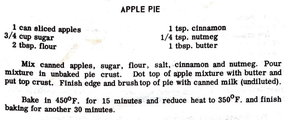 Mix canned apples, sugar, flour, salt, cinnamon and nutmeg. Pour mixture In unbaked pie crust. Dot top of apple mixture with butter and put top crust. Finish edge and brush top of pie with canned milk (undiluted).