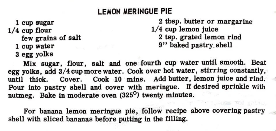 For banana lemon meringue pie, follow recipe above covering pastry shell with sliced bananas before putting in the filling.