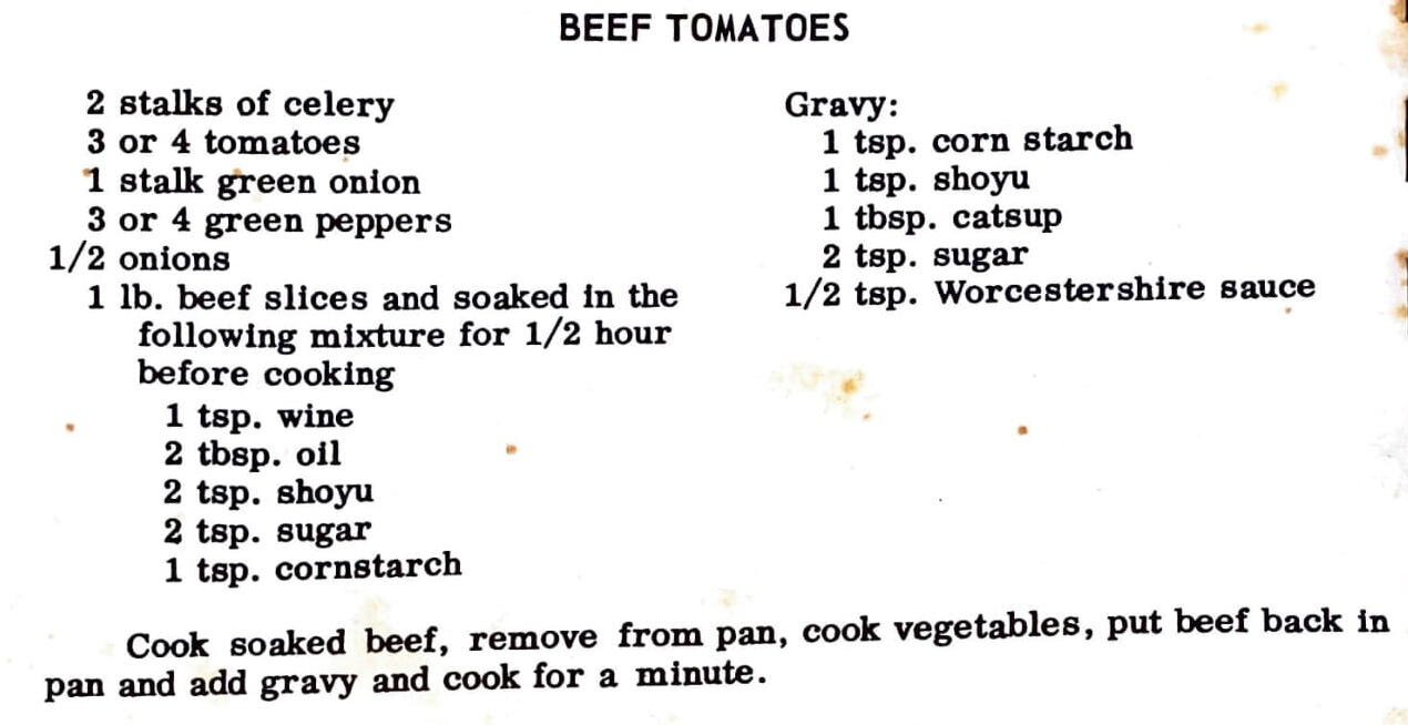 1 lb. beef slices and soaked in the following mixture for 1/2 hour before cooking: