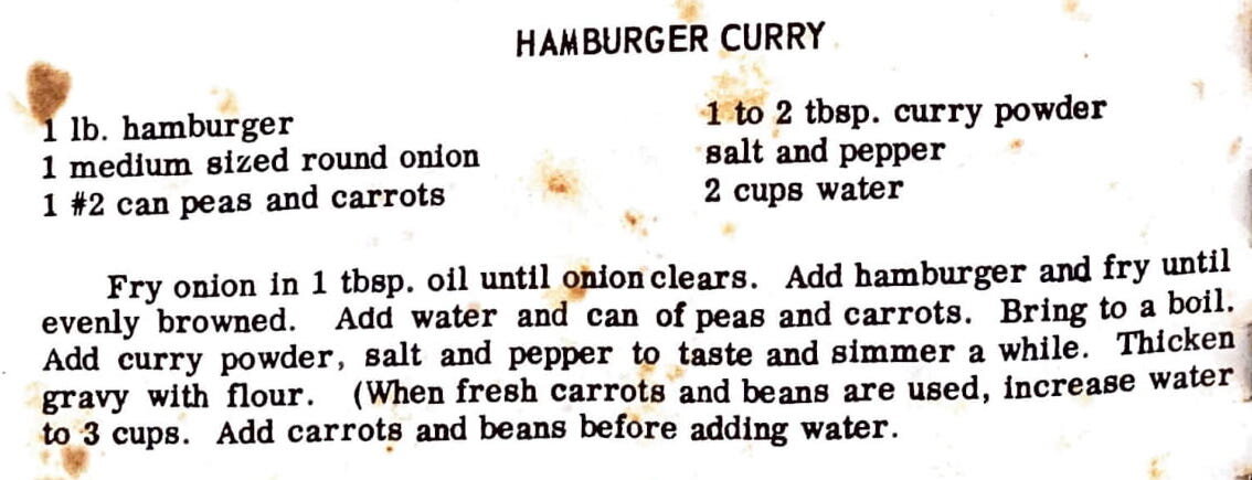 Fry onion in 1 tbsp. oil until onion clears. Add hamburger and fry until evenly browned. Add water and can of peas and carrots. Bring to a boil. Add curry powder, salt and pepper to taste and simmer a while. Thicken gravy with flour. (When fresh carrots and beans are used, Increase water to 3 cups. Add carrots and beans before adding water.