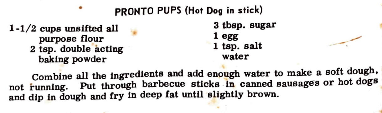 Combine all the ingredients and add enough water to make a soft dough, not running Put through barbecue sticks in canned sausages or hot dogs and dip ln dough and fry in deep fat until slightly brown.