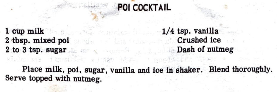 Place milk, poi, sugar, vanilla and ice in shaker. Blend thoroughly. Serve topped with nutmeg.