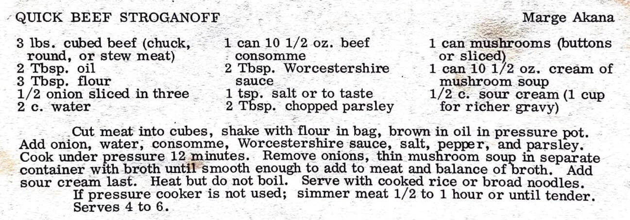 Cut meat into cubes, shake with flour in bag, brown in oil in pressure pot. Add onion, water, consomme, Worcestershire sauce, salt, pepper, and parsley. Cook under pressure 12 minutes. Remove onions, thin mushroom soup in separate container with broth until smooth enough to add to meat and balance of broth. Add sour cream last. Heat but do not boil. Serve with cooked rice or broad noodles. If pressure cooker is not used; simmer meat 1/2 to 1 hour or until tender. Serves 4 to 6.