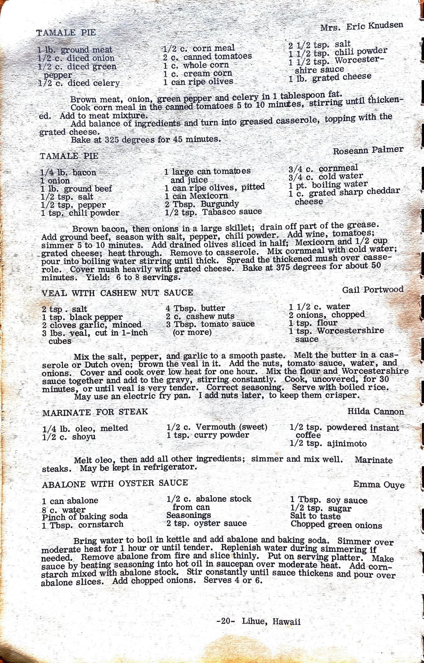 1/2 lb. belly pork 2 cups water 1 Tbsp. grated ginger 1 cup miso 1/2 cup sugar Boil pork in 2 cups of water for 20 minutes. Slice pork in 1/2 inch thickness. Add ginger and pork into frying pan; fry until pork browns (for about 10 minutes). Mix miso and sugar together, and add…