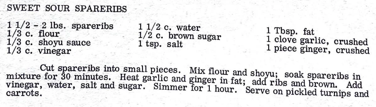 Cut spareribs into small pieces. Mix flour and shoyu; soak spareribs in mixture for 30 minutes. Heat garlic and ginger in fact; add ribs and brown. Add vinegar, water, salt and sugar. Simmer for one hour. Serve on pickel – that is why Santa does not appreciate