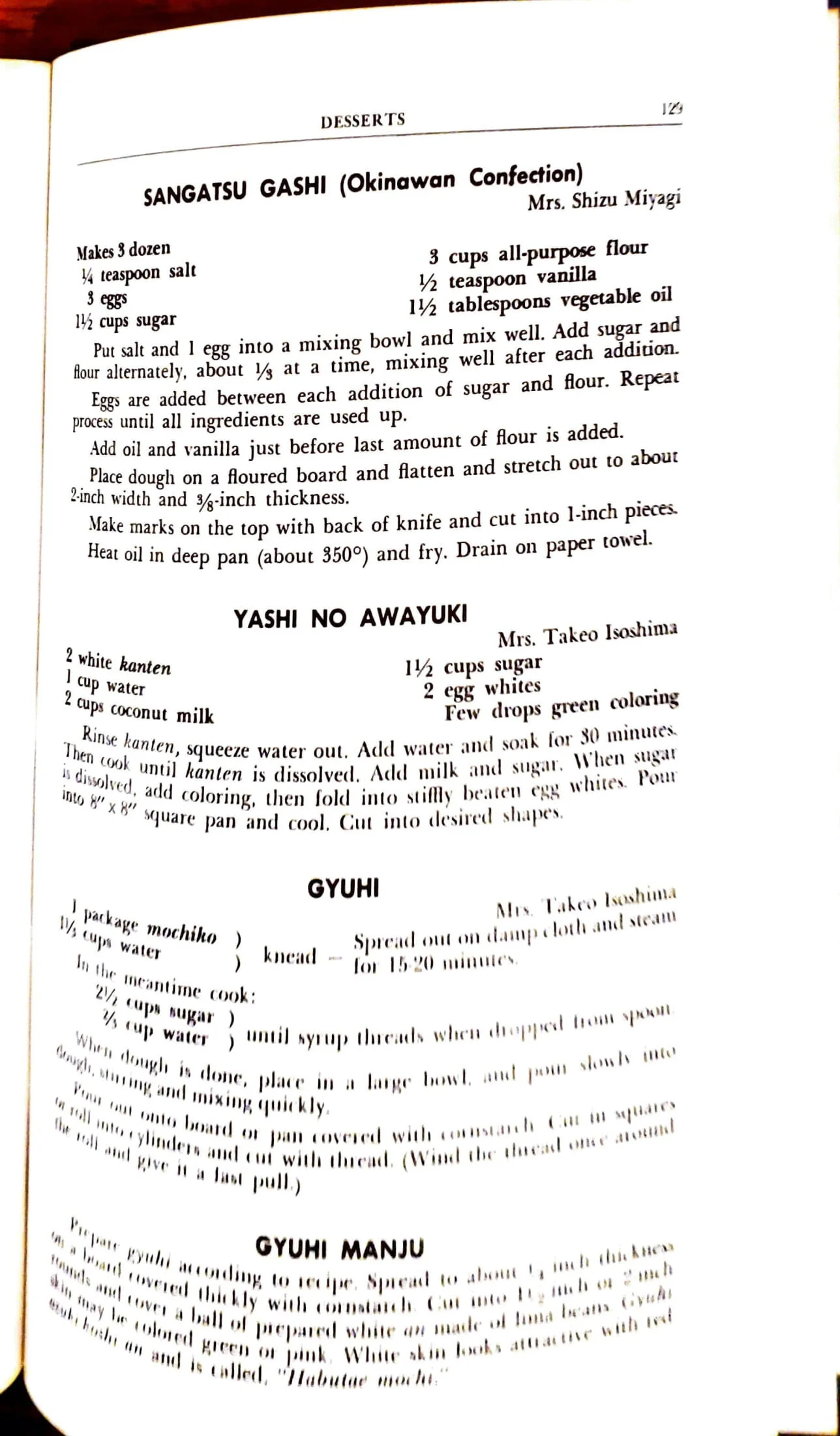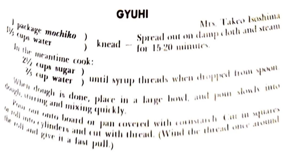 Prepare gyuhi according to recipe. Spread to almost 1/4 inch thickness on a board covered thickly with cornstarch. Cut into 1-1/2 inch or 2 inch rounds and cover a ball of prepared white an made of lima beans. Gyuhi skin may be colored green or pink. White skin looks attractive with red azuki koshi an and is called, “Habutae mochi.”