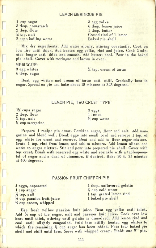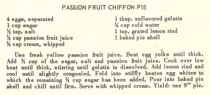 Use fresh yellow passion fruit juice. Beat egg yolks until thick. Add 1/2 cup of the sugar, salt and passion fruit juice. Cook over low heat until thick, stirring until gelatin is dissolved. Add lemon rind and cool until slightly congealed. Fold into stiffly beaten egg whites to which the remaining 1/2 cup sugar has been added. Pour into baked pie shell and chill until firm. Serve with whipped cream. Yield: one 9″ pie.