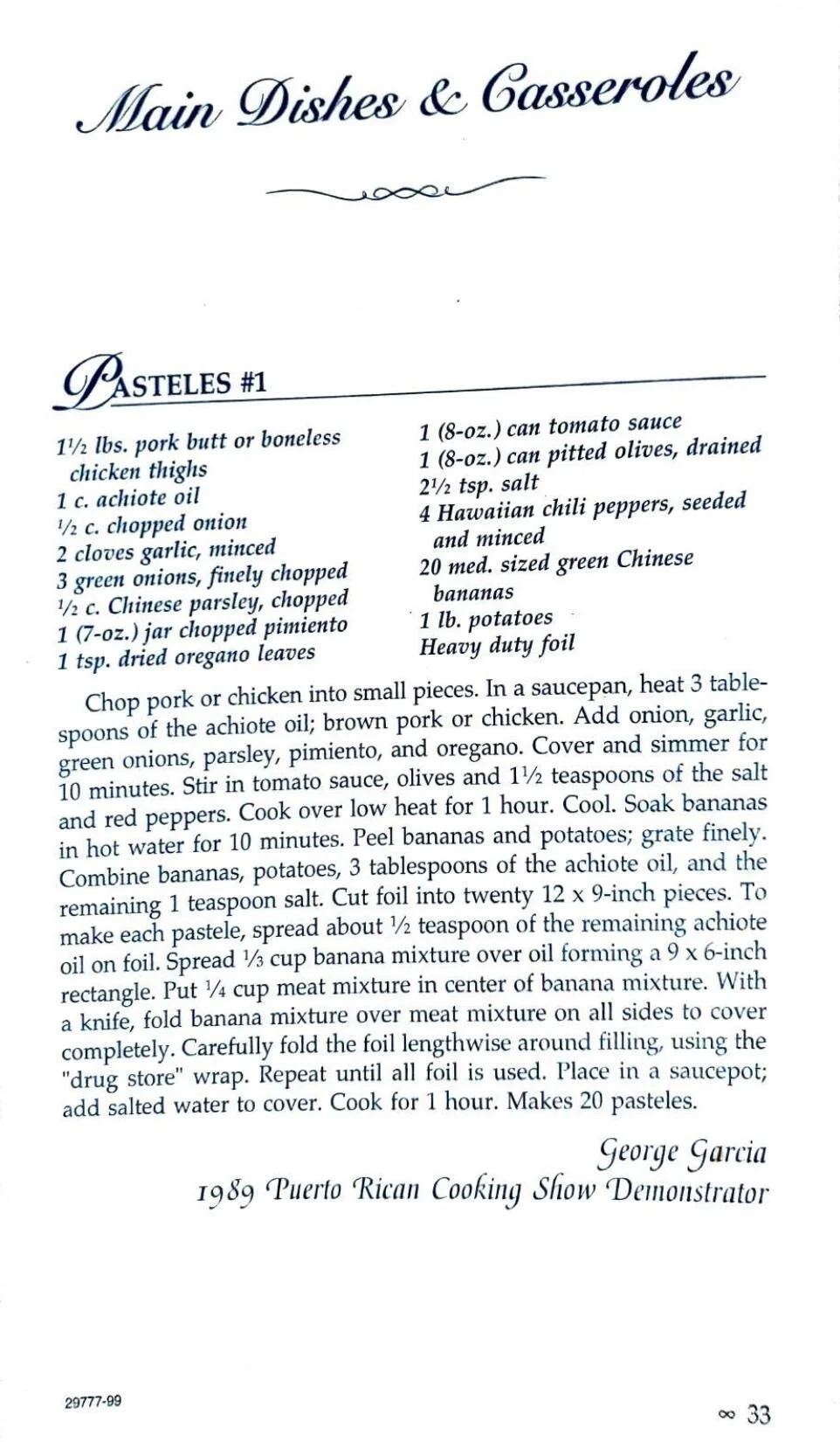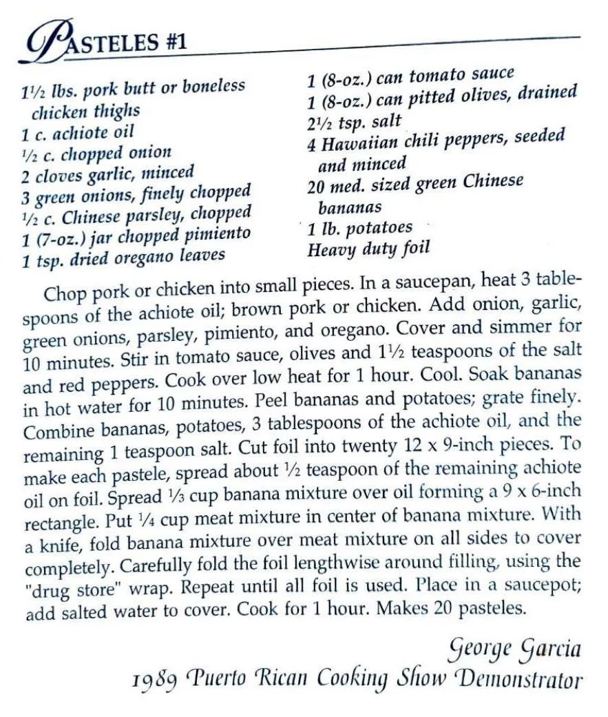 Chop pork or chicken into small pieces. In a saucepan, heat 3 tablespoons of the achiote oil; brown pork or chicken. Add onion, garlic, green onions, parsley, pimiento, and oregano. Cover and simmer for 10 minutes. Stir in tomato sauce, olives and 11/2 teaspoons of the salt and red peppers. Cook over low heat for 1 hour. Cool. Soak bananas in hot water for 10 minutes. Peel bananas and potatoes; grate finely. Combine bananas, potatoes, 3 tablespoons of the achiote oil, and the remaining 1 teaspoon salt. Cut foil into twenty 12 x 9-inch pieces. To make each pastele, spread about 1/2 teaspoon of the remaining achiote oil on foil. Spread V3 cup banana mixture over oil forming a 9 x 6-inch rectangle. Put 1/4 cup meat mixture in center of banana mixture. With a knife, fold banana mixture over meat mixture on all sides to cover completely. Carefully fold the foil lengthwise around filling, using the “drug store” wrap. Repeat until all foil is used. Place in a saucepot; add salted water to cover. Cook for 1 hour. Makes 20 pasteles.