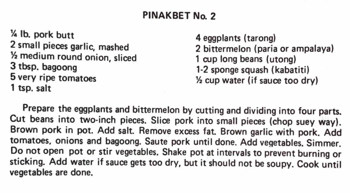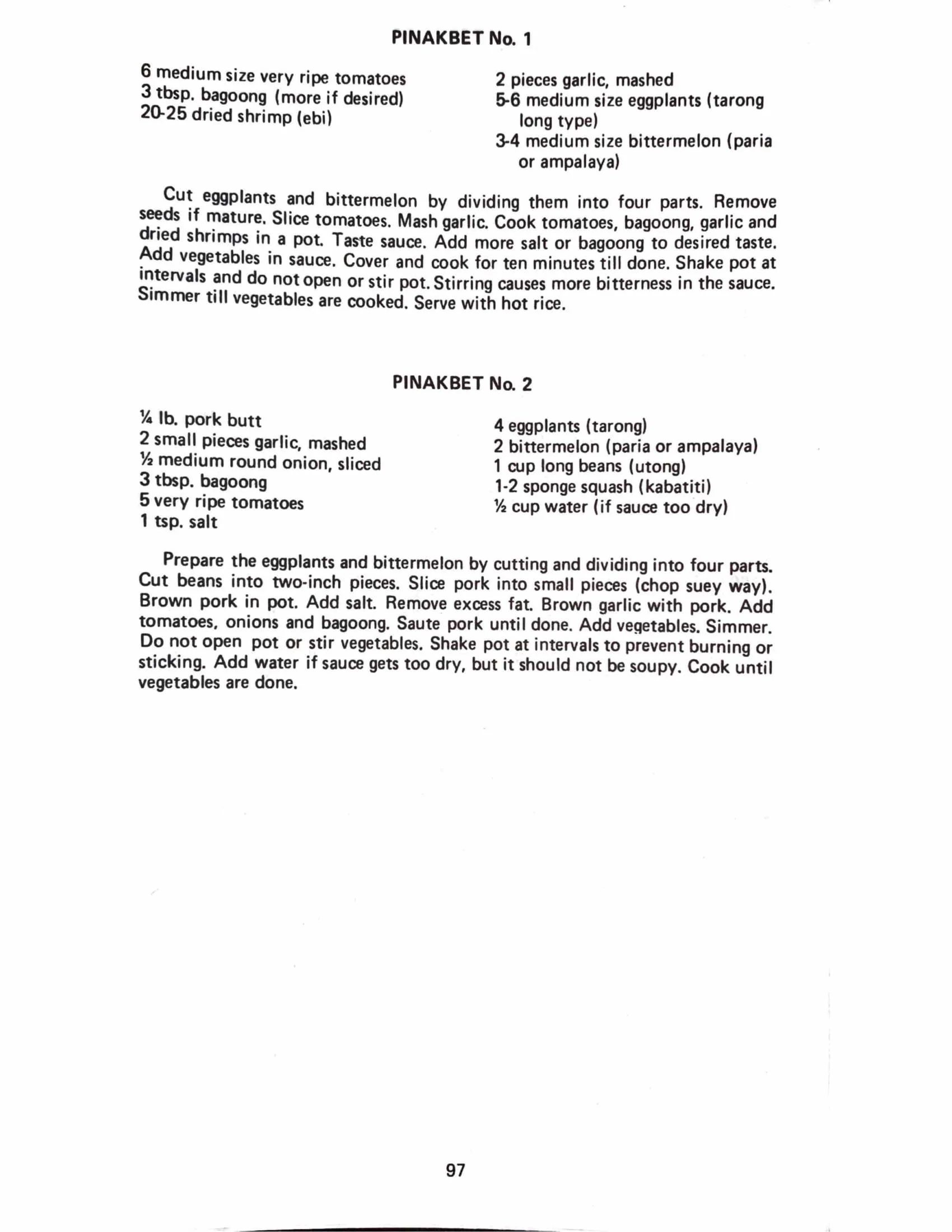 1 cup water 10 dried shrimps 1/3 cup pig skin (crackels) 2 tbsp. shoyu 1 pkg. fresh lima beans (1 lb. shelled) 1 tsp. salt 1 tsp. monosodium glutamate Boil water in a sauce pan with shrimps and pig skin for 5 minutes. Add shoyu and lima beans and cook for 15 minutes or until…