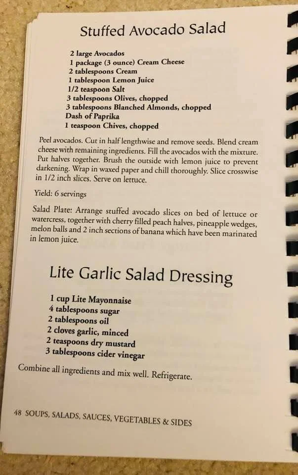 Salad Plate: Arrange stuffed avocado slices on bed of lettuce or watercress, together with cherry filled peach halves, pineapple wedges, melon balls and 2 inch sections of banana which have been marinated in lemon juice.