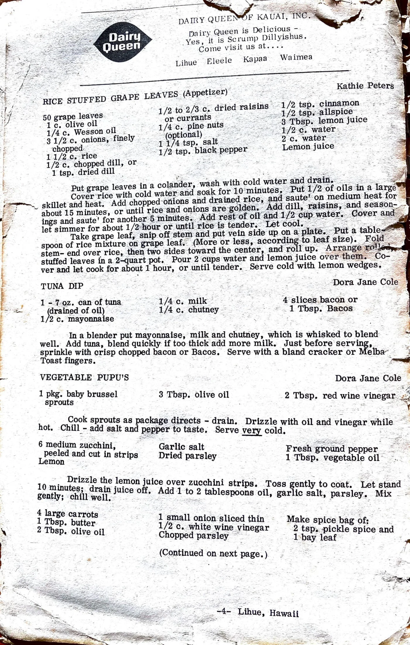 Meatballs: 1 lb. ground round 1 tsp. salt 1/2 tsp. pepper 2/3 cup canned milk 3/4 cup oatmeal Mix and make into balls. Brown meatballs and simmer in sauce for 1/2 hour. Sauce: 1/2 cup catsup 2 Tbsp. brown sugar 2 Tbsp. vinegar 1 Tbsp. Worcestershire sauce 1 Tbsp. shoyu 2 tsp. prepared mustard Stir…