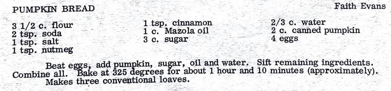 2 c. sifted flour 2 tsp. baking powder 1/2 tsp. soda 1 tsp. salt 1 tsp. cinnamon 1/2 tsp. nutmeg 1 c. Libby’s solid pack pumpkin 1 c. sugar 1/2 c. milk 2 eggs 1/4 c. softened butter 1 c. chopped walnuts Sift together first 6 ingredients. Combine pumpkin, sugar, milk and eggs in mixing…