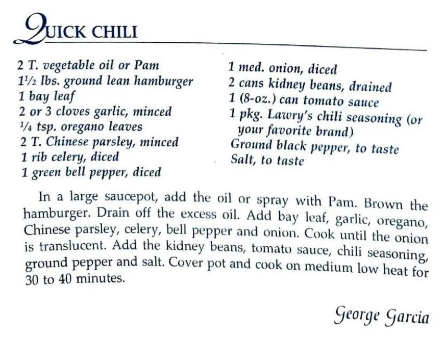 In a large saucepot, add the oil or spray with Pam. Brown the hamburger. Drain off the excess oil. Add bay leaf, garlic, oregano, Chinese parsley, celery, bell pepper and onion. Cook until the onion is translucent. Add the kidney beans, tomato sauce, chili seasoning, ground pepper and salt. cover pot and cook on medium low heat for 30 to 40 minutes.
