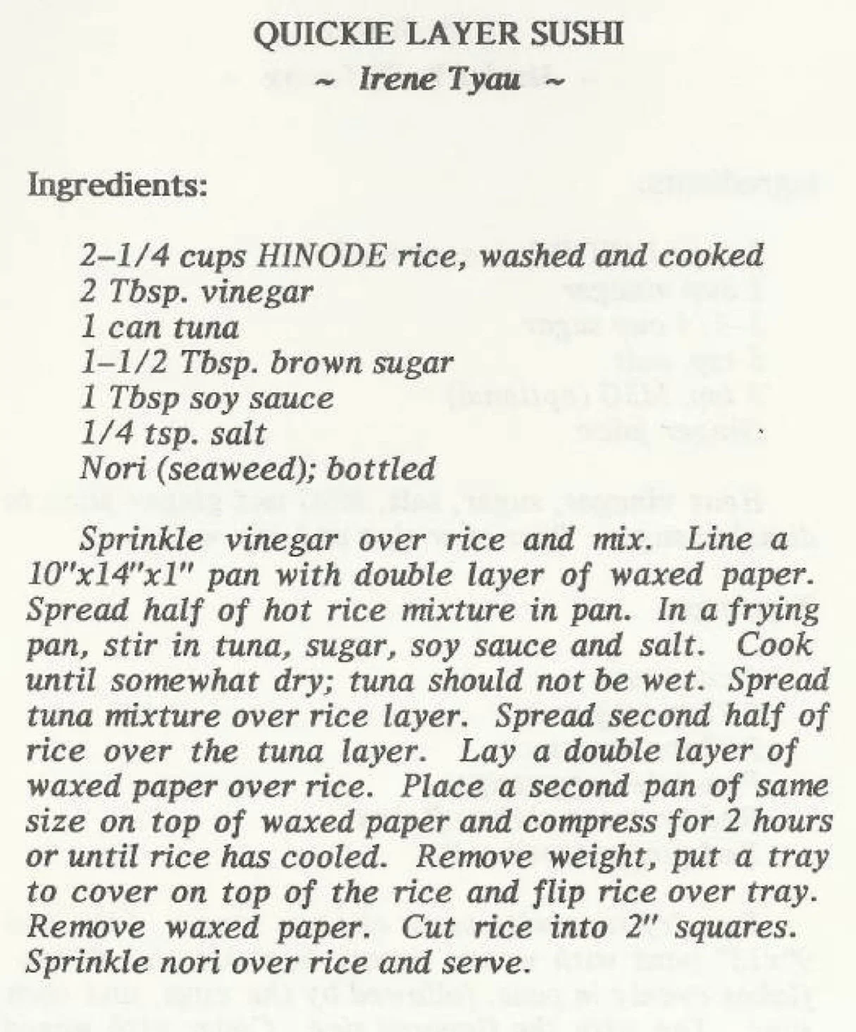 1/4 cup sugar 1/2 tsp. salt 1/4 tsp. monosodium glutamate 2 tbsp. sake ** 1/2 cup rice vinegar 1-1/2 cups water 2 cups rice Combine sugar, salt, monosodium glutamate, sake, vinegar, and water in a saucepan. Stir to dissolve sugar and salt. Rinse and drain rice; add to liquid in sauce pan. Cover and bring…