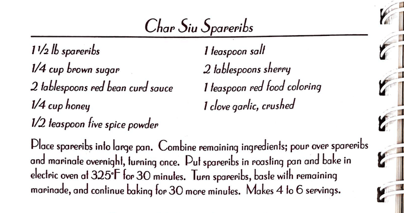 Place spareribs into large pan. Combine remaining ingredients; pour over spareribs and marinate overnight, turning once. Put spareribs in roasting pan and bake in electric oven al 325 F for 30 minutes. Turn spareribs, baste with remaining marinade, and continue baking for 30 more minutes. Makes 4 to 6 servings.
