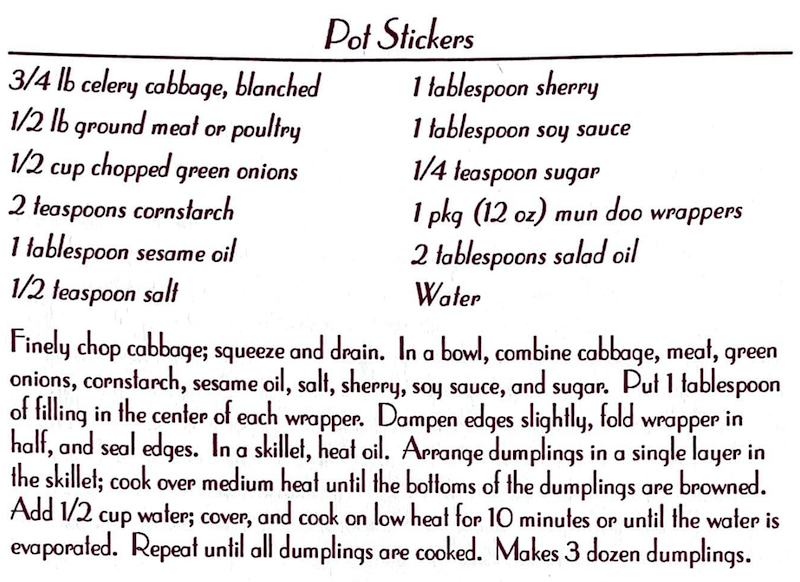 1 7-1/2 oz. can crab meat, flaked 1/4 cup water chestnuts, minced 2 T. green onion, minced 1/4 t. msg. 1 t. sherry (wine) 1 sm. egg, slightly beaten Dash salt 1 pkg. won ton wrappers 1 qt. oil for frying Combine filling ingredients. Mix until well blended. Place 1/2 t. filling in center of…