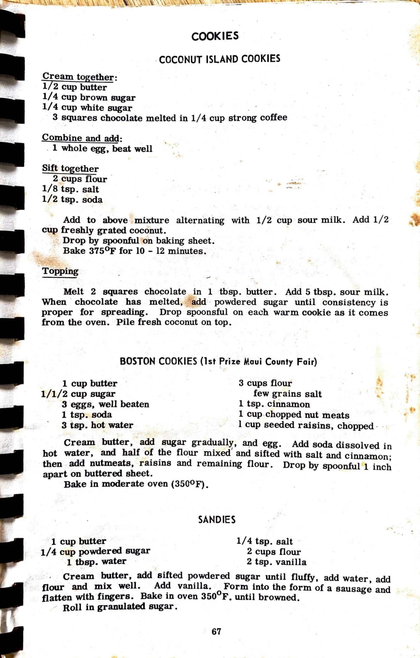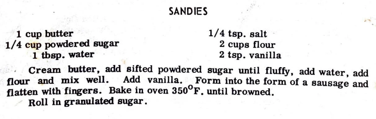 Cream butter, add sifted powdered sugar until fluffy, add water, add flour and mix well. Add vanilla. Form into the form of a sausage and flatten with fingers. Bake in oven 350 F. until browned.